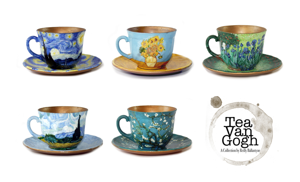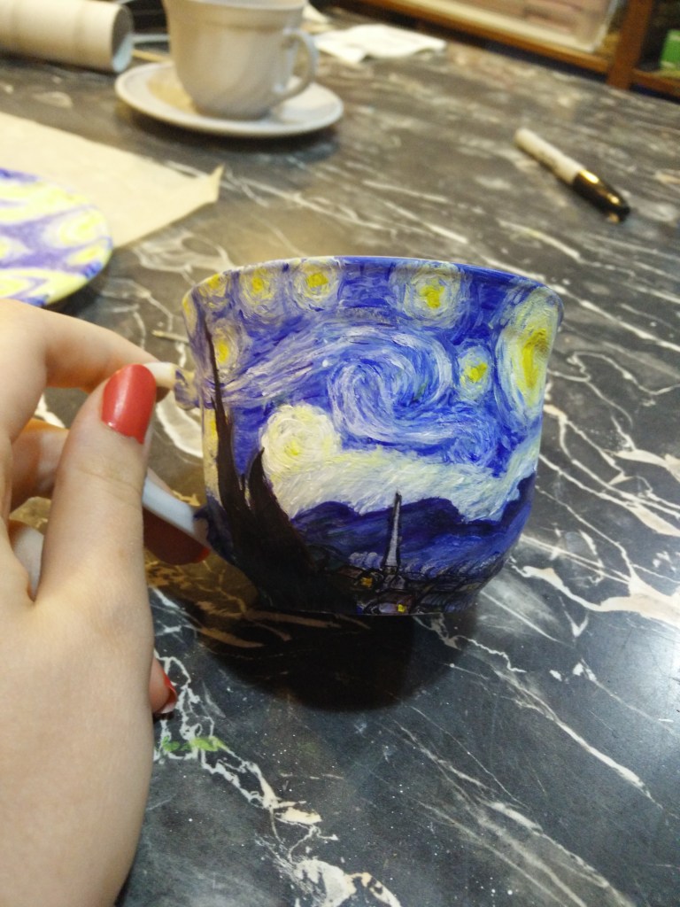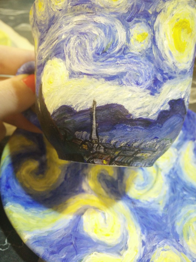 I found a set of five tea cups with matching saucers that my mother thought would be cute candles, I however, thought they would be brilliant canvases. Now, this was beyond normal for me. I’m a creative at heart, but of all the mediums I’ve explored and have become comfortable working with, paint was not one of them. So looking back on this project of mine, I still can’t understand how I decided to paint acrylic paint on porcelain teacups and saucers with a tony brush in the style of Vincent van Gogh’s masterpieces. Five and a half teacups and saucers later, I have a set of them.